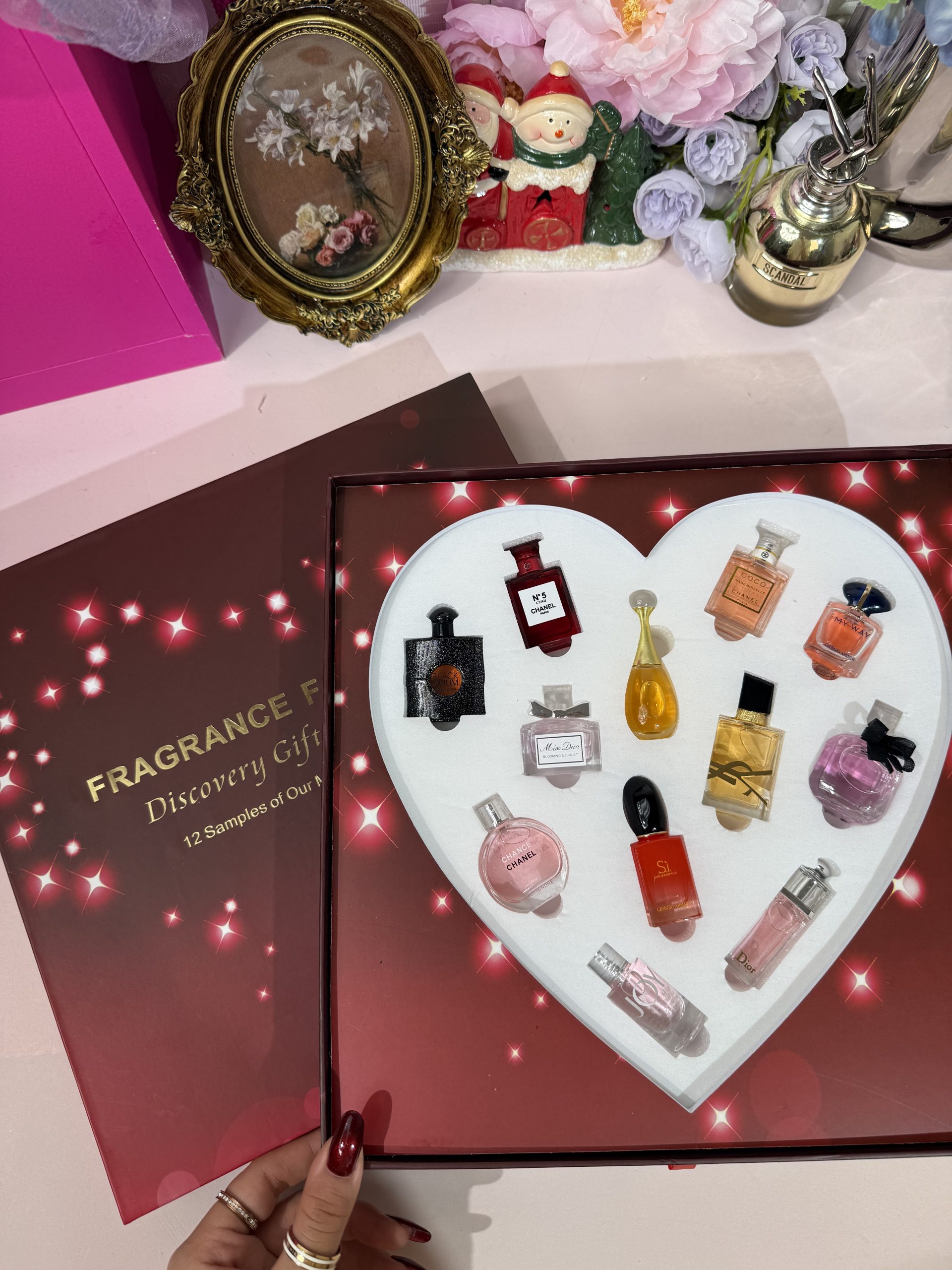 12 Designer-Inspired Mini Perfumes in Heart Box. The perfect Valentine's Day gift! This luxurious heart-shaped gift box includes 12 miniature designer-inspired perfumes in a beautiful presentation box with gift bag included.